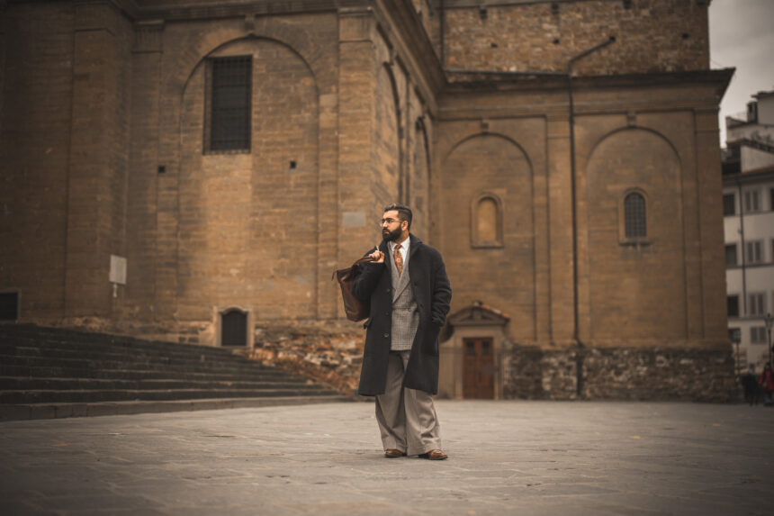This outfit was a little bit of a cheerful accident. I had the intention of carrying all of those items at Pitti Uomo — simply not collectively. The coat is by Personal White V.C., and was a crucial garment to take to Florence, particularly when the temperature drops within the night. The brushed cotton shirt and silk tie are by Budd, in addition to the peccary leather-based gloves. The jacket is from an previous collaboration between The Rake and Fox Brothers, which was a part of The Rake Tailor-made Clothes’ debut assortment — a 6×1 DB. Tremendous cool. The vast leg trousers are by Abbie Leach Atelier, and the sneakers are by Crockett & Jones. The leather-based tote is by Bennett Winch and also you’ll see me carrying it round 99 occasions out of 100.
